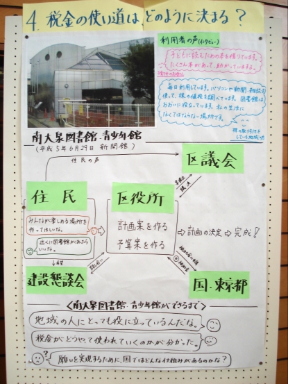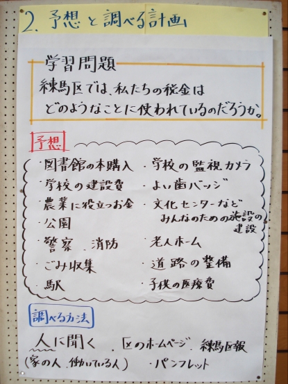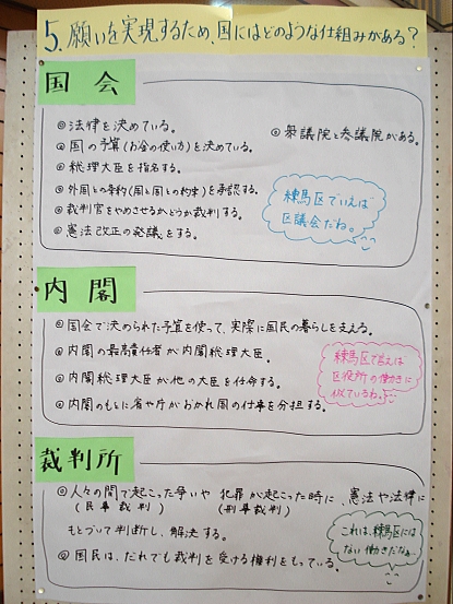 この単元では、まず「練馬区でわたしたちの税金がどのように使われているのか」について、自分たちの生活にとって身近なことを取り上げ、具体的に学習しました。次に、区の学習において習得した見方・考え方を活用して、「国民の願いを実現するため、国にはどのような仕組みがあるのか」、国会・内閣・裁判所の働きやそれらの関係等について学習しました。その中で、国民と裁判所のかかわりの一つである裁判員制度がどのような制度なのかを調べました。調べた事実をもとに、裁判員制度が導入された理由を自分なりに考え、各自がワークシートに記入して、今日の授業に臨んでいます。
