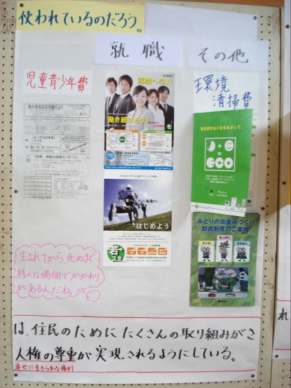 先生:「みんな、どんなことを書きましたか。まずは、資料を読んで分かったことについて。」