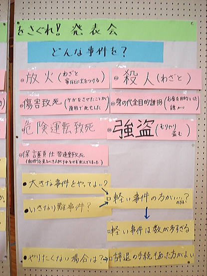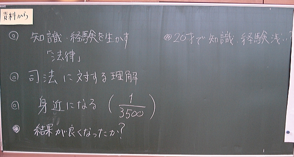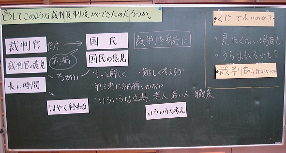 先生:「大きな疑問として、そもそもどうして裁判員制度が始まったのか、ということがありました。みんな、これに対する自分の考えを書いてきてくれたと思います。発表してくれる人。」→半分くらいの児童が手を挙げました。